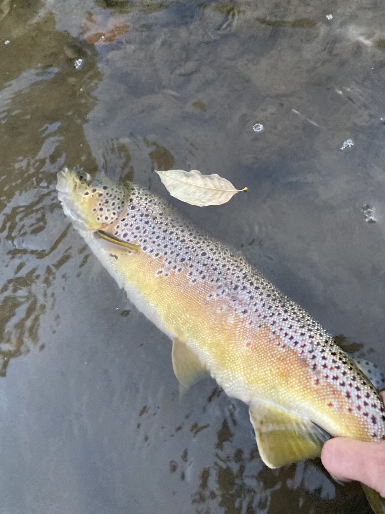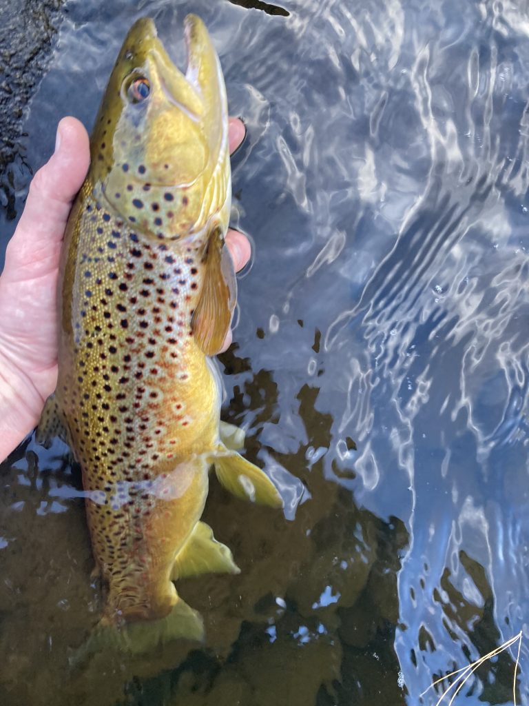 A stunning small stream Brown Trout caught on a caddis dry fly in the midst of a evening hatch in the fall of 2025. Photo by Matt Chapple.